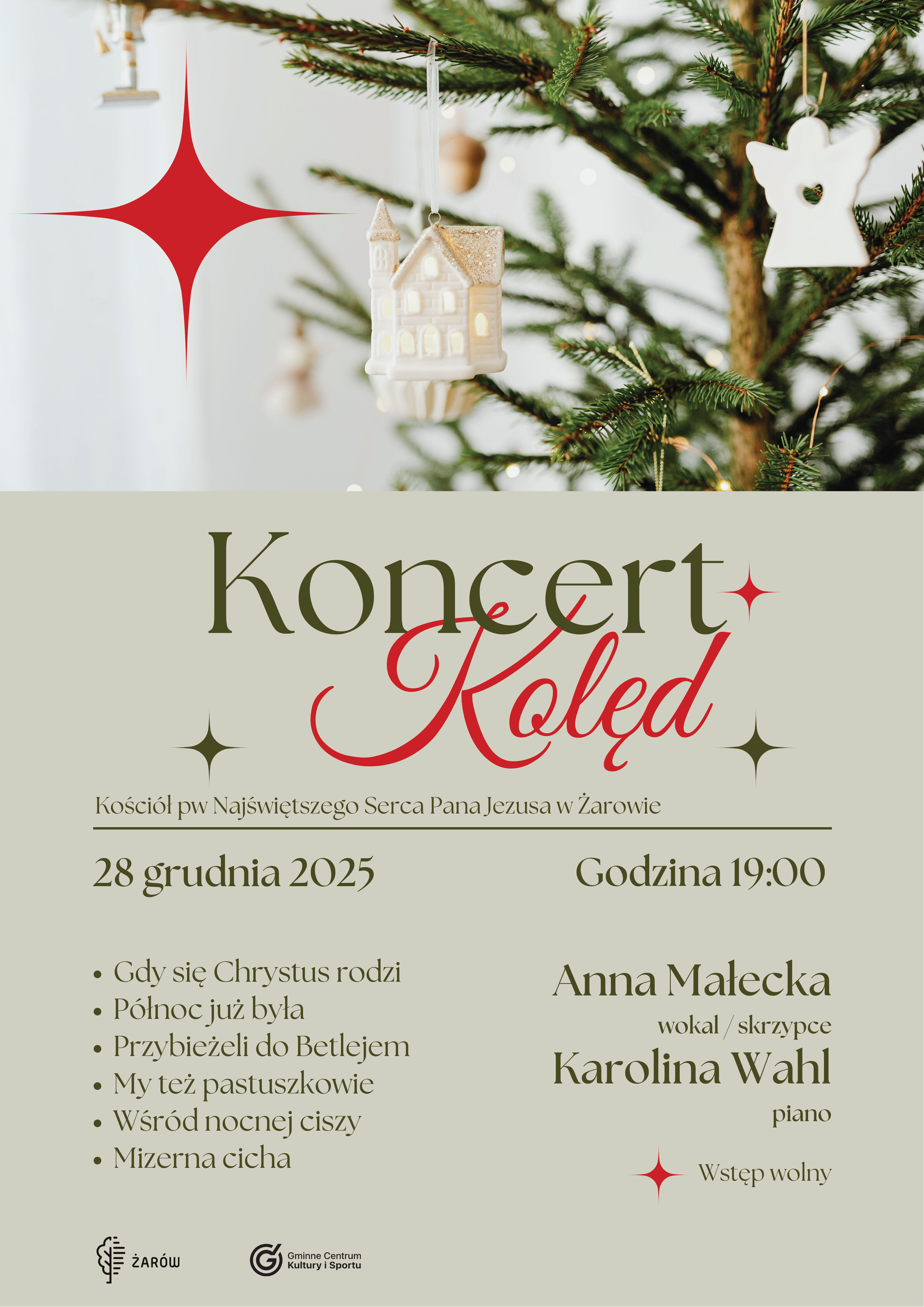 Gminne Centrum Kultury i Sportu zaprasza w niedzielę, 28 grudnia o godzinie 19:00 na Koncert Kolęd w wykonaniu Anny Małeckiej i Karoliny Wahl. Najpiękniejsze kolędy i pastorałki usłyszymy w kościele pw Najświętszego Serca Pana Jezusa w Żarowie.