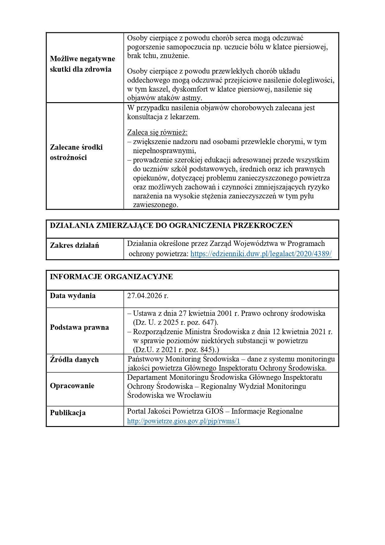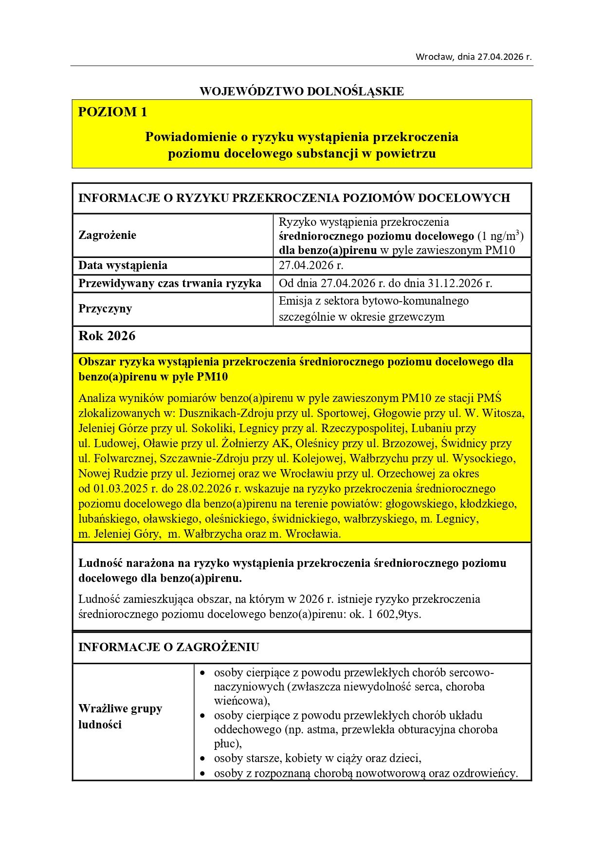 Zgodnie z art. 94 ust. 1b i 1c ustawy Prawo ochrony środowiska (Dz. U. z 2025 r. poz. 647) oraz rozporządzeniem Ministra Środowiska z dnia 24 sierpnia 2012 r. w sprawie poziomów niektórych substancji w powietrzu (Dz. U. 2021 r. poz. 845), Departament Monitoringu Środowiska GIOŚ przesyła powiadomienie o ryzyku wystąpienia w 2026 r. przekroczenia średniorocznego poziomu docelowego dla benzo(a)pirenu w pyle zawieszonym PM10 na części woj. dolnośląskiego (powiaty: głogowski, kłodzki, lubański, oławski, oleśnicki, świdnicki, wałbrzyski, m. Legnica, m. Jelenia Góra, m. Wałbrzych oraz m. Wrocław).